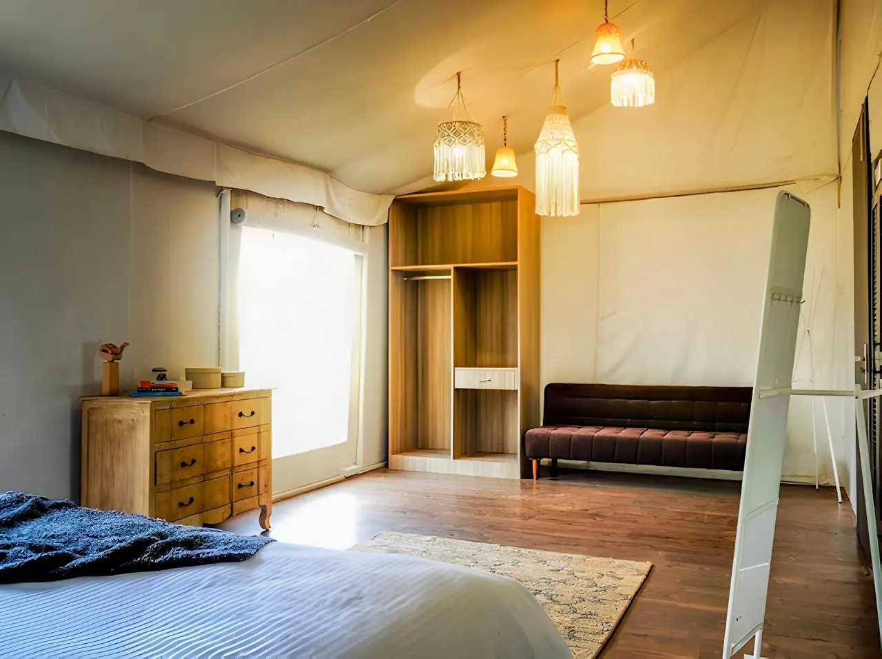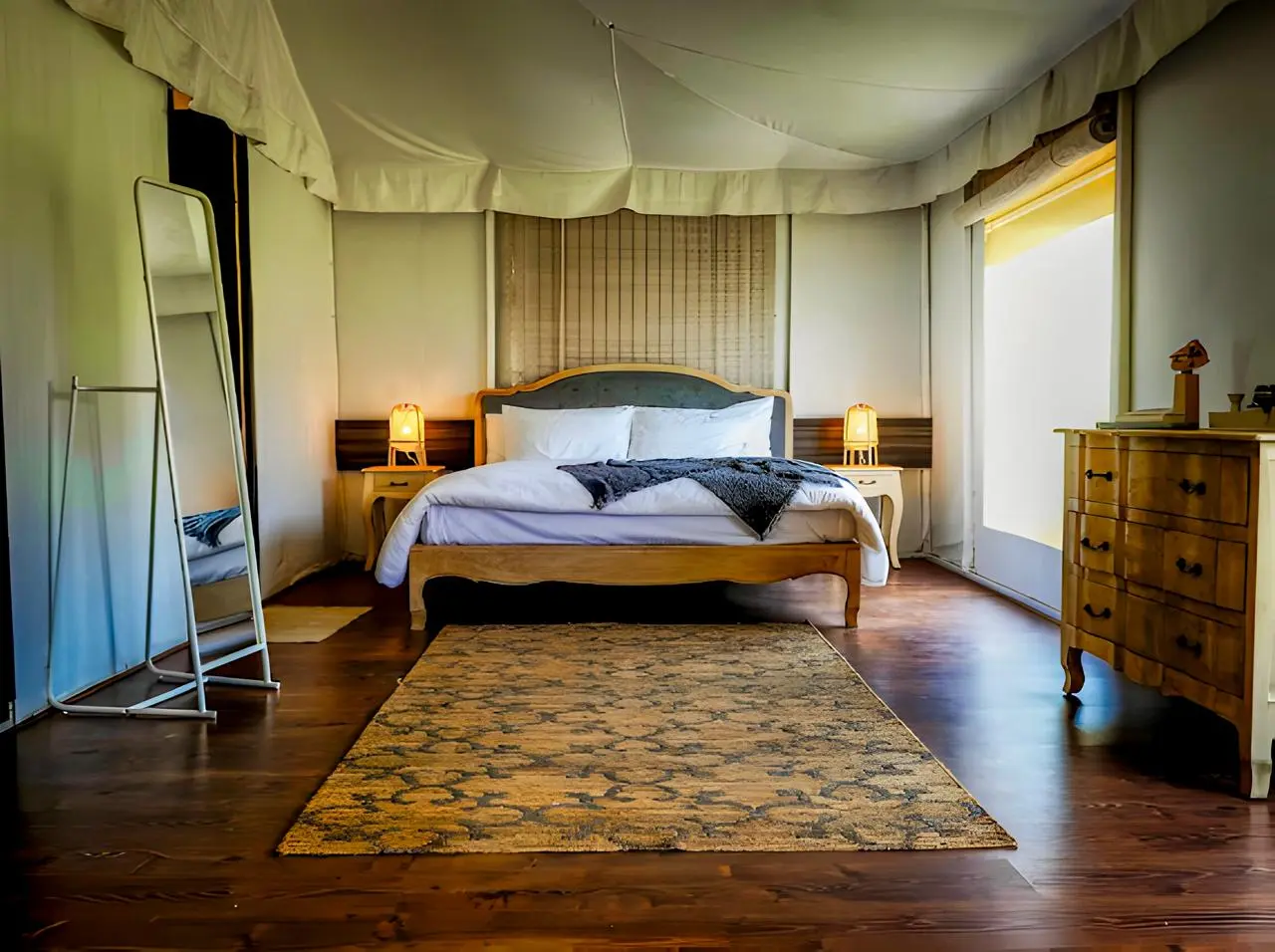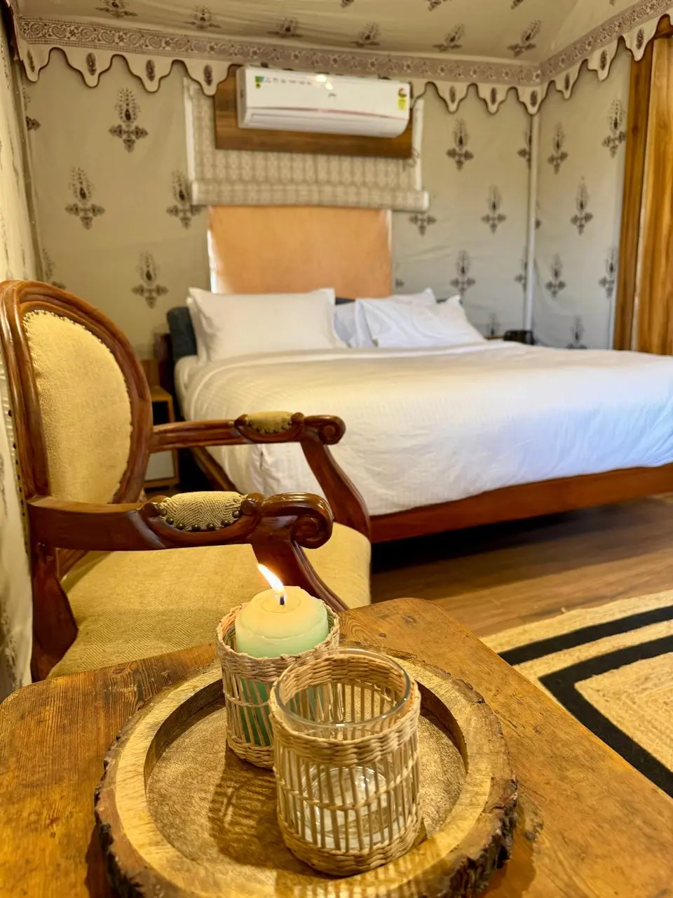 The Maharaja 2BHK Tent at Serenity Retreat is an opulent sanctuary that brings together space, elegance, and comfort amidst the beauty of nature. Designed for families or groups, this luxurious tent offers two well-appointed bedrooms along with a spacious living area, creating the perfect setting for both relaxation and intimate gatherings. Inside, the interiors are adorned with plush furnishings, tasteful décor, and modern amenities, ensuring that every moment of your stay is marked by comfort and sophistication.