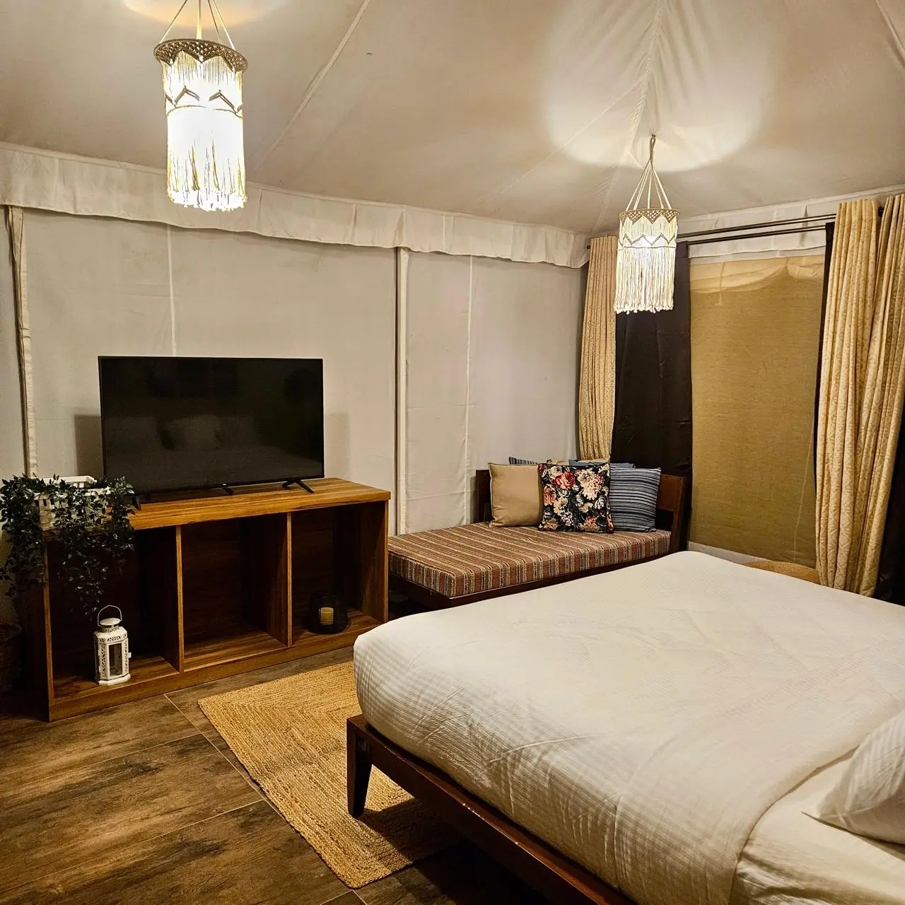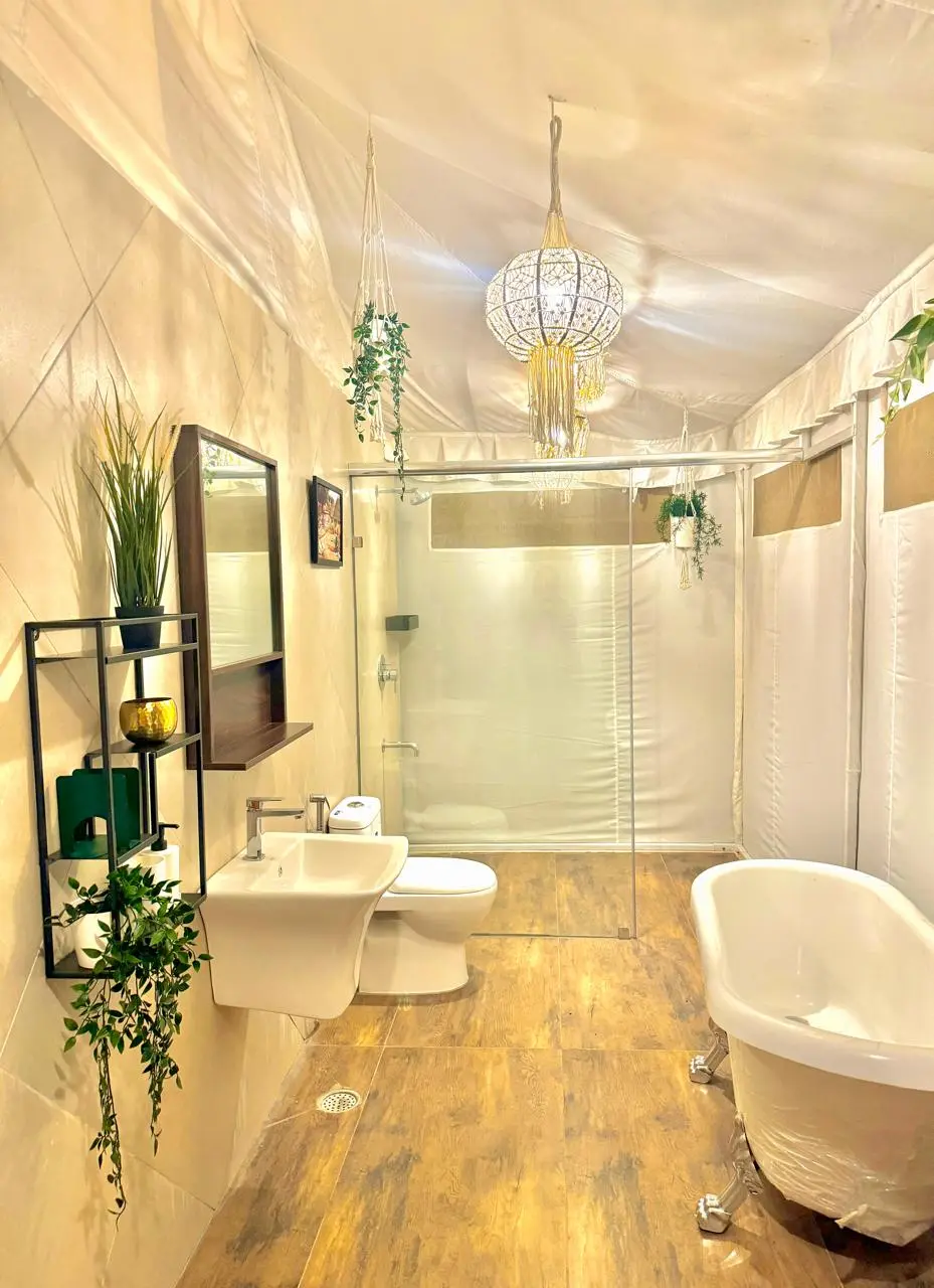The Samrat Studio Tent at Serenity Retreat offers a harmonious blend of luxury and tranquillity, creating an idyllic escape amid lush greenery. Nestled on a private 3,000 sq.ft. plot, this intimate studio tent is thoughtfully designed for those seeking privacy, comfort, and a deep connection with nature. Inside, you’ll find a spacious, air-conditioned bedroom with an attached bathroom, adorned with elegant furnishings and soothing décor to evoke peace and relaxation. The plush king-sized bed invites restful nights, while modern amenities cater to every comfort, making it an ideal retreat for couples or solo travelers alike.